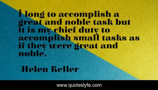 This page presents the quote "I long to accomplish a great and noble task but it is my chief duty to accomplish small tasks as if they were great and noble.". Author of this quote is Helen Keller. This quote is about day, one,.
