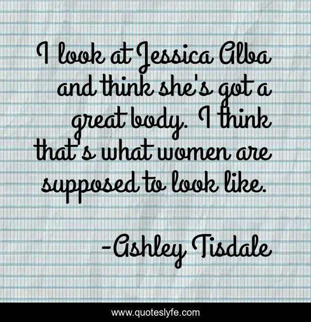 This page presents the quote "I look at Jessica Alba and think she's got a great body. I think that's what women are supposed to look like.". Author of this quote is Ashley Tisdale. This quote is about body, great, think,.