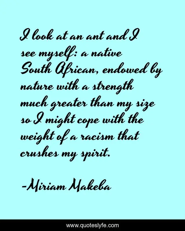 This page presents the quote "I look at an ant and I see myself: a native South African, endowed by nature with a strength much greater than my size so I might cope with the weight of a racism that crushes my spirit.". Author of this quote is Miriam Makeba. This quote is about myself, strength, racism,.