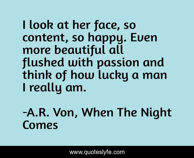 This page presents the quote "I look at her face, so content, so happy. Even more beautiful all flushed with passion and think of how lucky a man I really am.". Author of this quote is A.R. Von, When The Night Comes. This quote is about romance, books-reading, love, paranormal-romance, affection,.