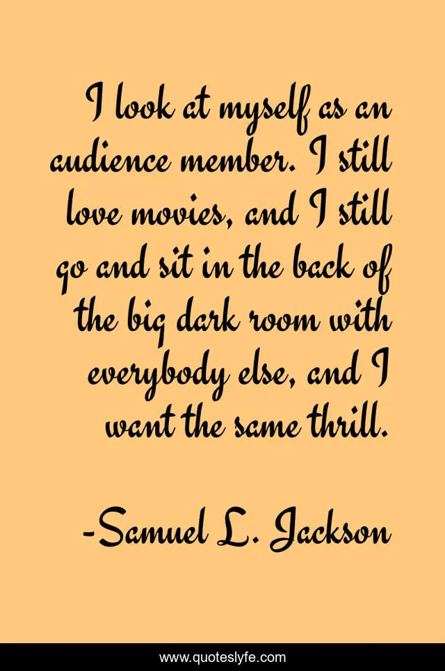 This page presents the quote "I look at myself as an audience member. I still love movies, and I still go and sit in the back of the big dark room with everybody else, and I want the same thrill.". Author of this quote is Samuel L. Jackson. This quote is about dark, myself, love, affection,.