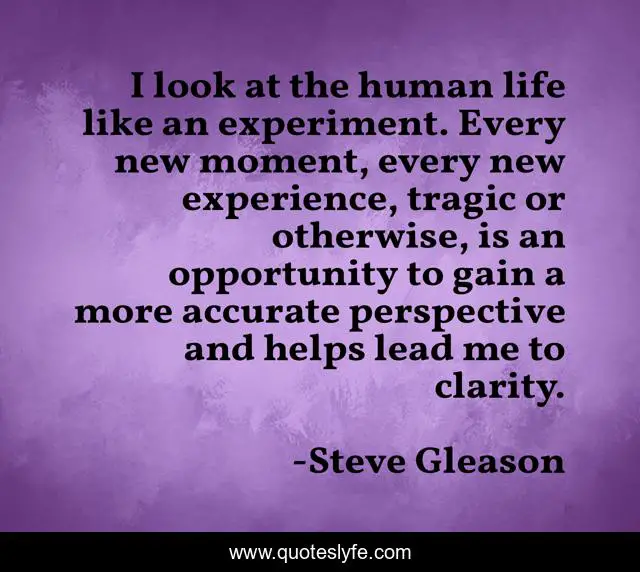 This page presents the quote "I look at the human life like an experiment. Every new moment, every new experience, tragic or otherwise, is an opportunity to gain a more accurate perspective and helps lead me to clarity.". Author of this quote is Steve Gleason. This quote is about life, opportunity,.