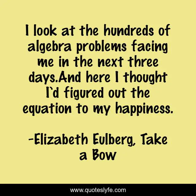 This page presents the quote "I look at the hundreds of algebra problems facing me in the next three days.And here I thought I’d figured out the equation to my happiness.". Author of this quote is Elizabeth Eulberg, Take a Bow. This quote is about charter, equation, happiness,.