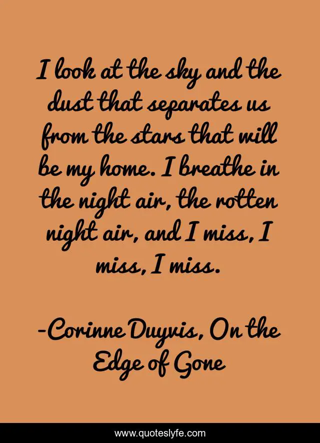 This page presents the quote "I look at the sky and the dust that separates us from the stars that will be my home. I breathe in the night air, the rotten night air, and I miss, I miss, I miss.". Author of this quote is Corinne Duyvis, On the Edge of Gone. This quote is about post-apocalyptic, young-adult, autism, space,.
