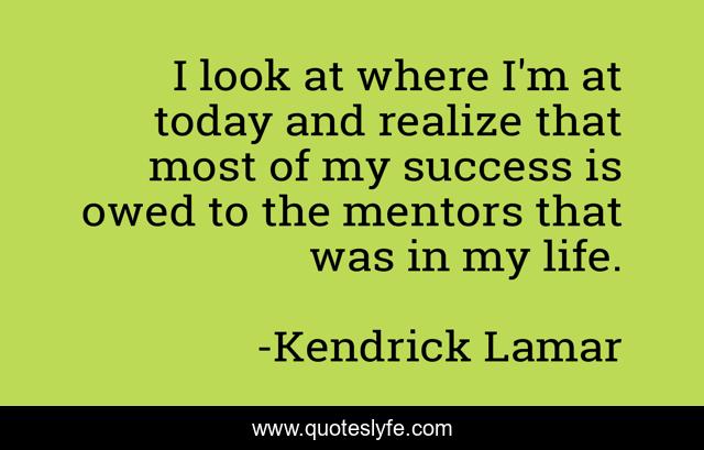 This page presents the quote "I look at where I'm at today and realize that most of my success is owed to the mentors that was in my life.". Author of this quote is Kendrick Lamar. This quote is about life, my life, today,.