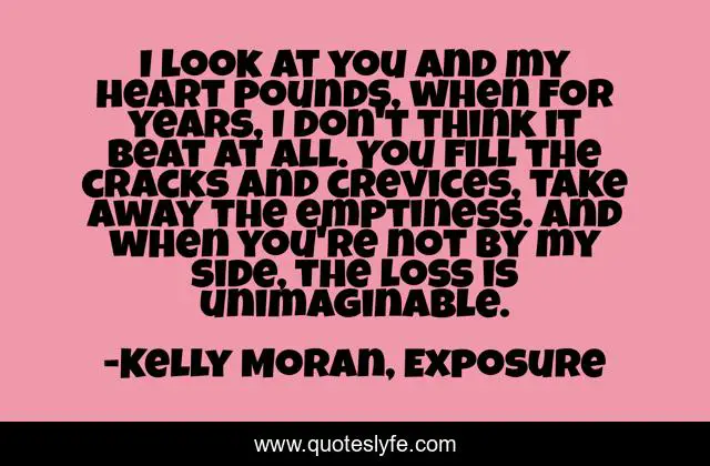This page presents the quote "I look at you and my heart pounds, when for years, I don't think it beat at all. You fill the cracks and crevices, take away the emptiness. And when you're not by my side, the loss is unimaginable.". Author of this quote is Kelly Moran, Exposure. This quote is about declarations-of-love, loss, emptiness, love, affection,.
