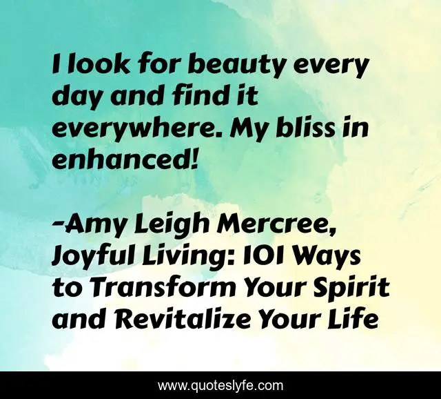 This page presents the quote "I look for beauty every day and find it everywhere. My bliss in enhanced!". Author of this quote is Amy Leigh Mercree, Joyful Living: 101 Ways to Transform Your Spirit and Revitalize Your Life. This quote is about life, quotes-de-la-vida, amy-leigh-mercree, beauty, quote-of-the-day, joyful-living, look-for-beauty, bliss, joyful-living-101,.