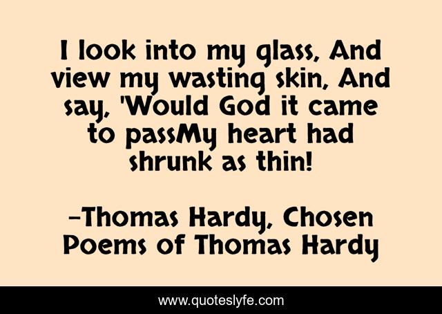 This page presents the quote "I look into my glass, And view my wasting skin, And say, 'Would God it came to passMy heart had shrunk as thin!". Author of this quote is Thomas Hardy, Chosen Poems of Thomas Hardy. This quote is about heartache, old-age,.