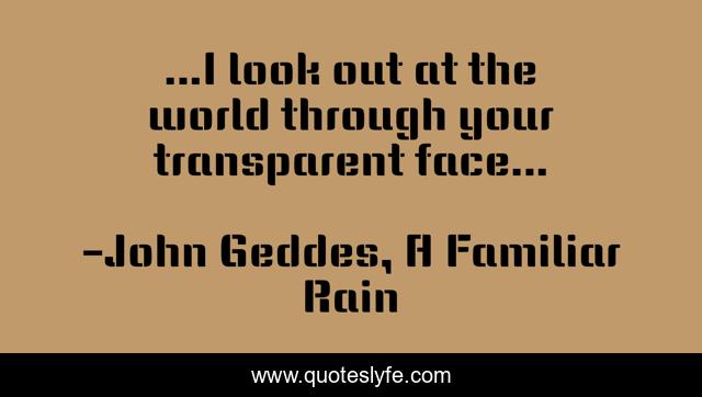 This page presents the quote "...I look out at the world through your transparent face...". Author of this quote is John Geddes, A Familiar Rain. This quote is about clarity, perspective,.