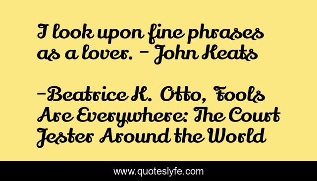 This page presents the quote "I look upon fine phrases as a lover. - John Keats". Author of this quote is Beatrice K. Otto, Fools Are Everywhere: The Court Jester Around the World. This quote is about reading, writing,.