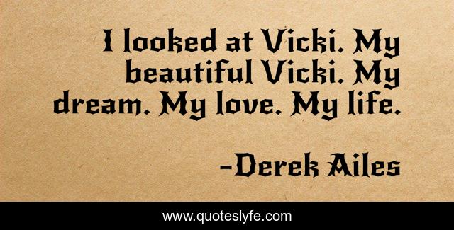 This page presents the quote "I looked at Vicki. My beautiful Vicki. My dream. My love. My life.". Author of this quote is Derek Ailes. This quote is about mythology, horror-story, horror-genre, horror-fantasy,.