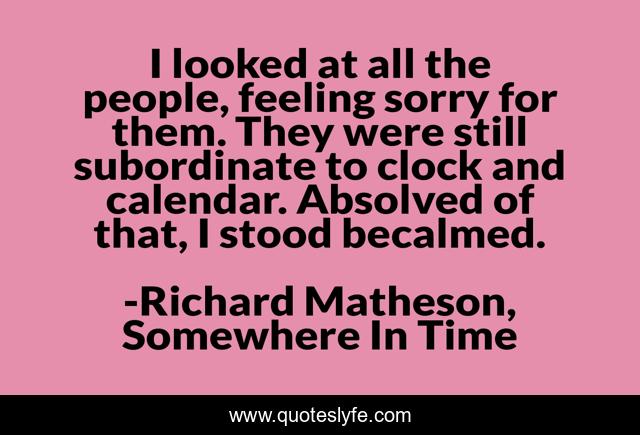 This page presents the quote "I looked at all the people, feeling sorry for them. They were still subordinate to clock and calendar. Absolved of that, I stood becalmed.". Author of this quote is Richard Matheson, Somewhere In Time. .