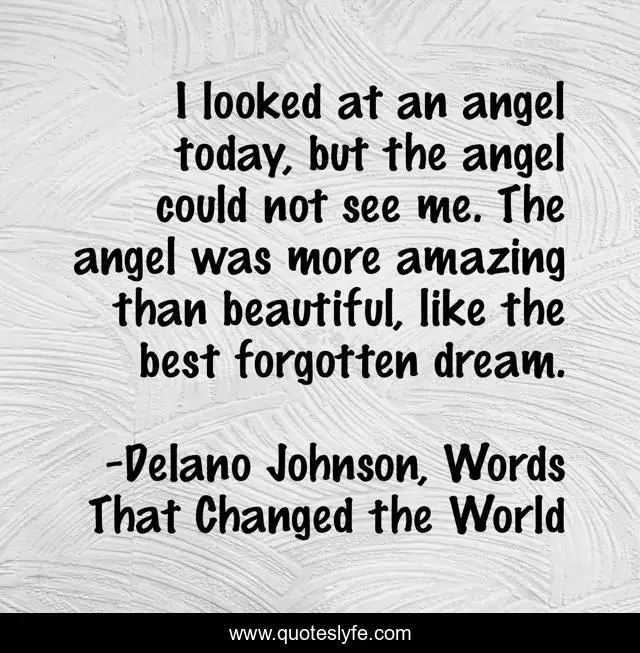This page presents the quote "I looked at an angel today, but the angel could not see me. The angel was more amazing than beautiful, like the best forgotten dream.". Author of this quote is Delano Johnson, Words That Changed the World. This quote is about love-hurts, lovers, love, delano-johnson, daydream, cinderella, love-at-first-sight, rare-images-of-love, fantasy,.