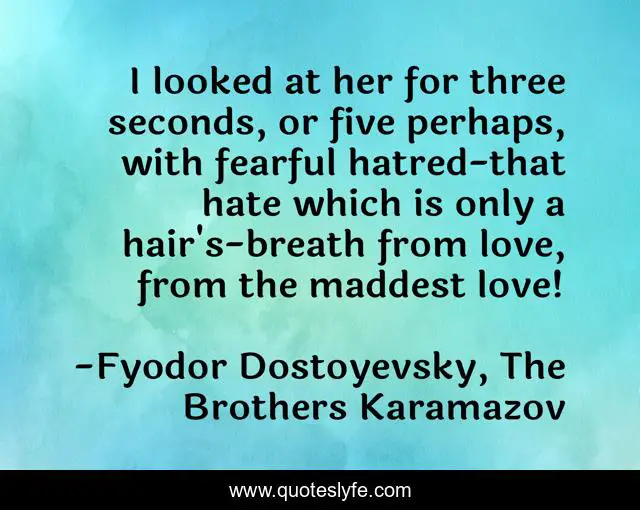 This page presents the quote "I looked at her for three seconds, or five perhaps, with fearful hatred-that hate which is only a hair's-breath from love, from the maddest love!". Author of this quote is Fyodor Dostoyevsky, The Brothers Karamazov. .