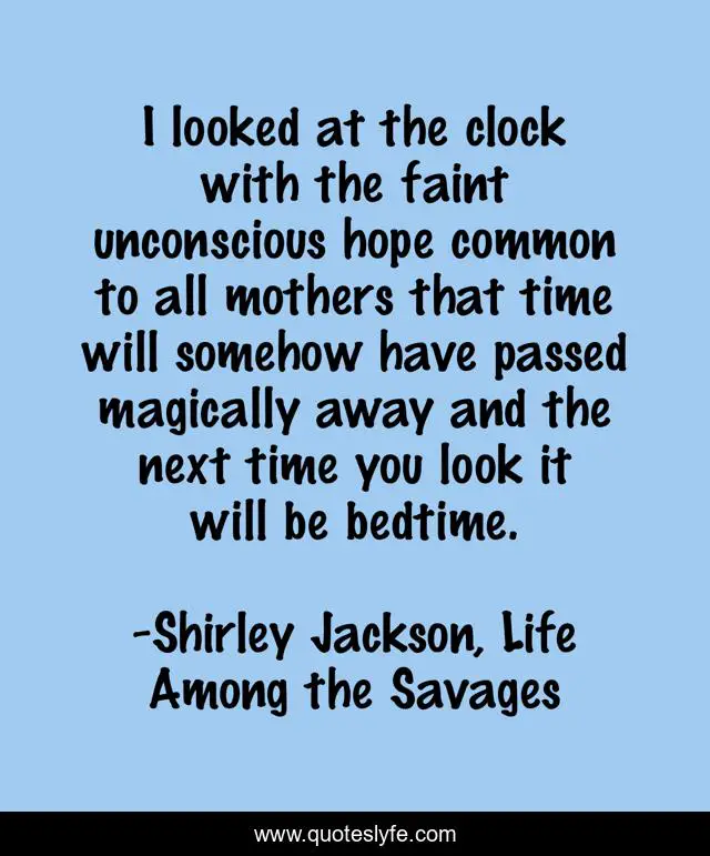 This page presents the quote "I looked at the clock with the faint unconscious hope common to all mothers that time will somehow have passed magically away and the next time you look it will be bedtime.". Author of this quote is Shirley Jackson, Life Among the Savages. This quote is about motherhood, bedtime,.