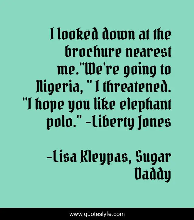 This page presents the quote "I looked down at the brochure nearest me."We're going to Nigeria, " I threatened. "I hope you like elephant polo." -Liberty Jones". Author of this quote is Lisa Kleypas, Sugar Daddy. This quote is about gage, sugar-daddy, humor, liberty,.