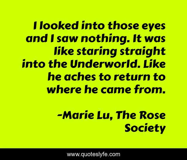 This page presents the quote "I looked into those eyes and I saw nothing. It was like staring straight into the Underworld. Like he aches to return to where he came from.". Author of this quote is Marie Lu, The Rose Society. This quote is about abyss, underworld, darkness,.