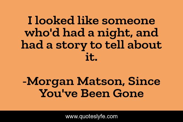 This page presents the quote "I looked like someone who'd had a night, and had a story to tell about it.". Author of this quote is Morgan Matson, Since You've Been Gone. This quote is about socialite, someone, happiness, night, smile, special, happy,.