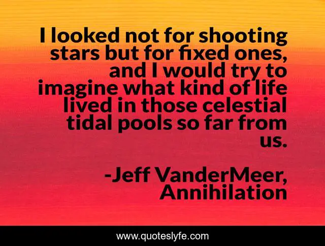This page presents the quote "I looked not for shooting stars but for fixed ones, and I would try to imagine what kind of life lived in those celestial tidal pools so far from us.". Author of this quote is Jeff VanderMeer, Annihilation. This quote is about life, stars, space,.