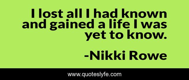 This page presents the quote "I lost all I had known and gained a life I was yet to know.". Author of this quote is Nikki Rowe. This quote is about strength, inspire, powerful, disability, overcoming, encouragement, hope, resilient, fortitude,.