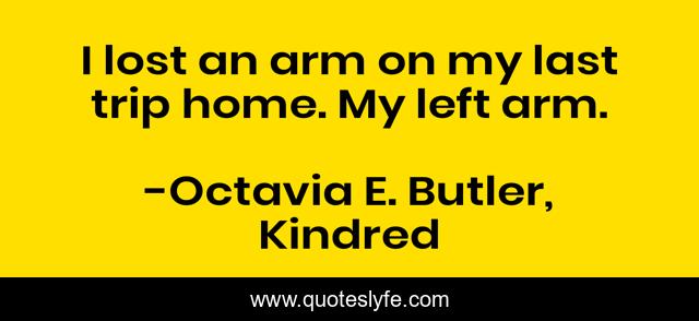 This page presents the quote "I lost an arm on my last trip home. My left arm.". Author of this quote is Octavia E. Butler, Kindred. This quote is about race-and-racism-in-america, octavia-butler, science-fiction,.