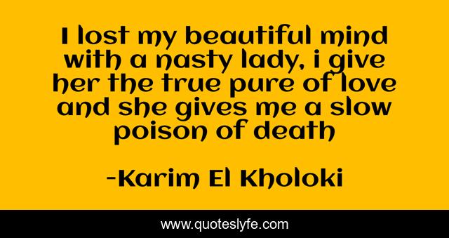 This page presents the quote "I lost my beautiful mind with a nasty lady, i give her the true pure of love and she gives me a slow poison of death". Author of this quote is Karim El Kholoki. This quote is about death, hate,.