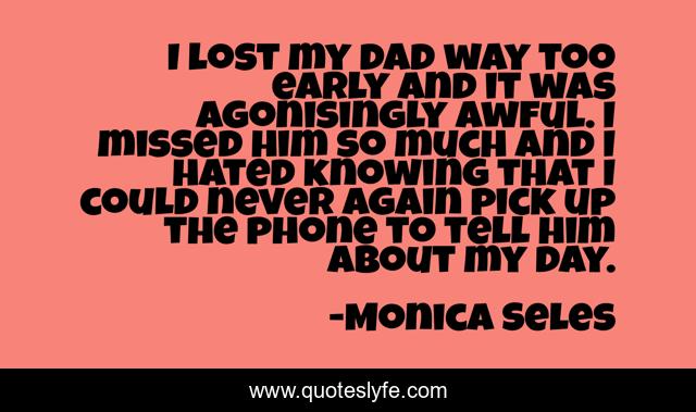 This page presents the quote "I lost my dad way too early and it was agonisingly awful. I missed him so much and I hated knowing that I could never again pick up the phone to tell him about my day.". Author of this quote is Monica Seles. This quote is about early, day, lost,.