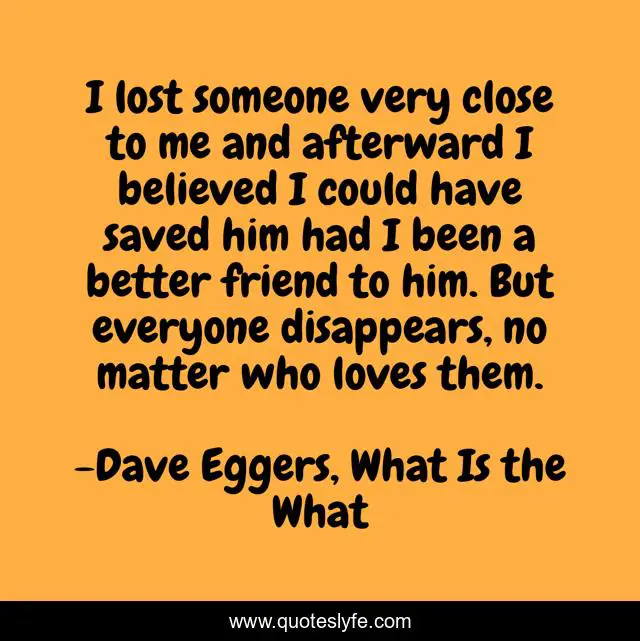 This page presents the quote "I lost someone very close to me and afterward I believed I could have saved him had I been a better friend to him. But everyone disappears, no matter who loves them.". Author of this quote is Dave Eggers, What Is the What. .