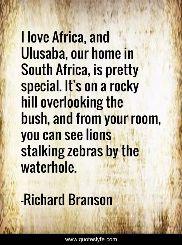 This page presents the quote "I love Africa, and Ulusaba, our home in South Africa, is pretty special. It's on a rocky hill overlooking the bush, and from your room, you can see lions stalking zebras by the waterhole.". Author of this quote is Richard Branson. This quote is about see, love, affection,.