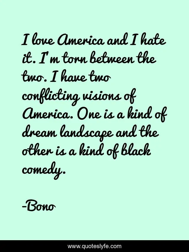 This page presents the quote "I love America and I hate it. I'm torn between the two. I have two conflicting visions of America. One is a kind of dream landscape and the other is a kind of black comedy.". Author of this quote is Bono. This quote is about america, bono,.