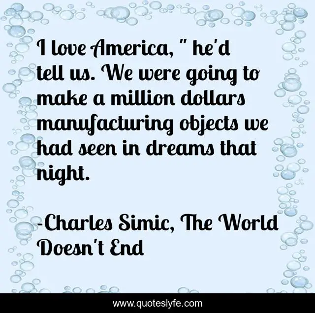 This page presents the quote "I love America, " he'd tell us. We were going to make a million dollars manufacturing objects we had seen in dreams that night.". Author of this quote is Charles Simic, The World Doesn't End. This quote is about america, dreams,.