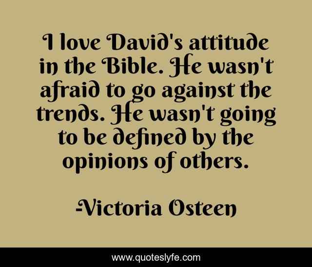 This page presents the quote "I love David's attitude in the Bible. He wasn't afraid to go against the trends. He wasn't going to be defined by the opinions of others.". Author of this quote is Victoria Osteen. This quote is about opinions, bible, love, affection,.