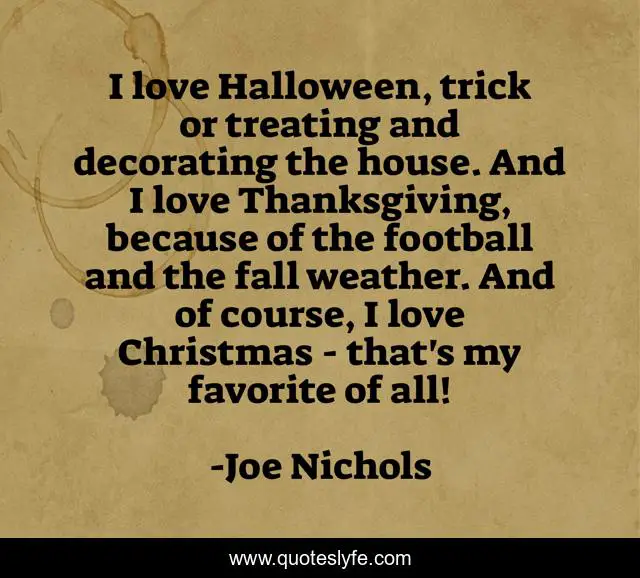 This page presents the quote "I love Halloween, trick or treating and decorating the house. And I love Thanksgiving, because of the football and the fall weather. And of course, I love Christmas - that's my favorite of all!". Author of this quote is Joe Nichols. This quote is about football, love, thanksgiving, affection,.