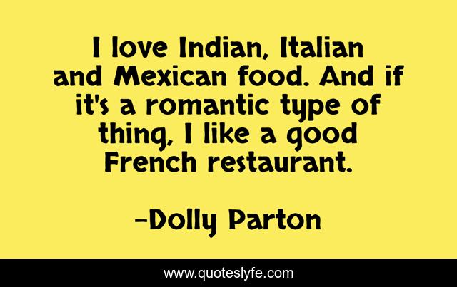 This page presents the quote "I love Indian, Italian and Mexican food. And if it's a romantic type of thing, I like a good French restaurant.". Author of this quote is Dolly Parton. This quote is about food, good, love, affection,.