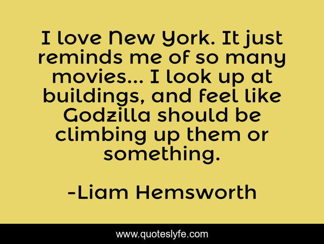 This page presents the quote "I love New York. It just reminds me of so many movies... I look up at buildings, and feel like Godzilla should be climbing up them or something.". Author of this quote is Liam Hemsworth. This quote is about me, new york, love, affection,.