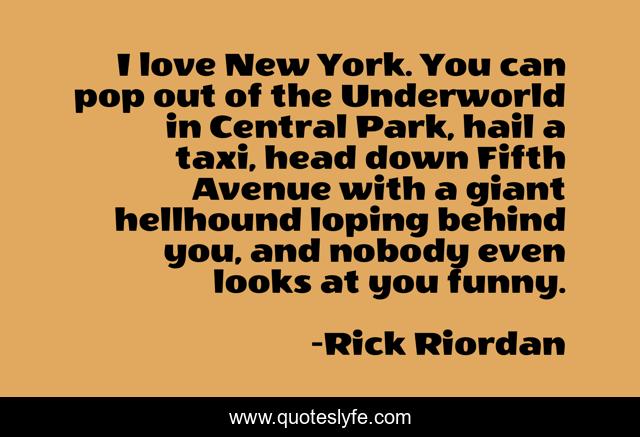 This page presents the quote "I love New York. You can pop out of the Underworld in Central Park, hail a taxi, head down Fifth Avenue with a giant hellhound loping behind you, and nobody even looks at you funny.". Author of this quote is Rick Riordan. This quote is about anonymity, new-york-city, blasé, nonchalance,.