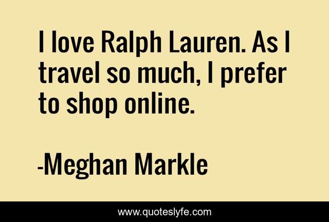 This page presents the quote "I love Ralph Lauren. As I travel so much, I prefer to shop online.". Author of this quote is Meghan Markle. This quote is about love, ralph, affection, online,.