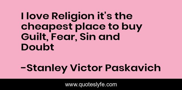 This page presents the quote "I love Religion it's the cheapest place to buy Guilt, Fear, Sin and Doubt". Author of this quote is Stanley Victor Paskavich. This quote is about tithing, religion, belief, church,.