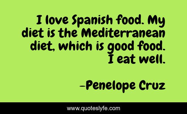 This page presents the quote "I love Spanish food. My diet is the Mediterranean diet, which is good food. I eat well.". Author of this quote is Penelope Cruz. This quote is about food, good, love, affection,.