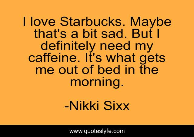 This page presents the quote "I love Starbucks. Maybe that's a bit sad. But I definitely need my caffeine. It's what gets me out of bed in the morning.". Author of this quote is Nikki Sixx. This quote is about me, love, affection, sad,.
