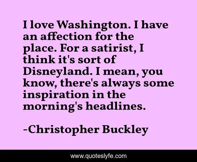 This page presents the quote "I love Washington. I have an affection for the place. For a satirist, I think it's sort of Disneyland. I mean, you know, there's always some inspiration in the morning's headlines.". Author of this quote is Christopher Buckley. This quote is about love, think, affection,.