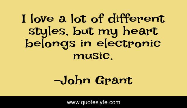 This page presents the quote "I love a lot of different styles, but my heart belongs in electronic music.". Author of this quote is John Grant. This quote is about heart, different, love, affection,.