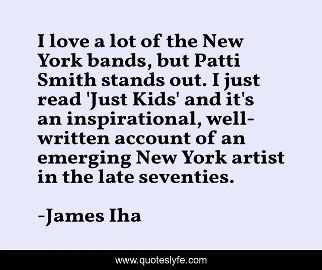 This page presents the quote "I love a lot of the New York bands, but Patti Smith stands out. I just read 'Just Kids' and it's an inspirational, well-written account of an emerging New York artist in the late seventies.". Author of this quote is James Iha. This quote is about new york, love, affection, artist,.