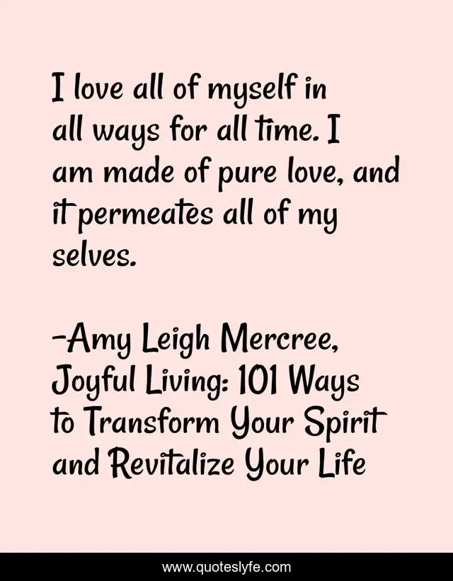 This page presents the quote "I love all of myself in all ways for all time. I am made of pure love, and it permeates all of my selves.". Author of this quote is Amy Leigh Mercree, Joyful Living: 101 Ways to Transform Your Spirit and Revitalize Your Life. This quote is about quotes-de-la-vida, amy-leigh-mercree, quote-of-the-day, quotes-tumblr, inspirational, quote-about-life, enthusiasm, quotes-twitter, quote-of-the-week,.