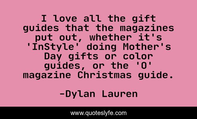 This page presents the quote "I love all the gift guides that the magazines put out, whether it's 'InStyle' doing Mother's Day gifts or color guides, or the 'O' magazine Christmas guide.". Author of this quote is Dylan Lauren. This quote is about love, day, affection, mother,.