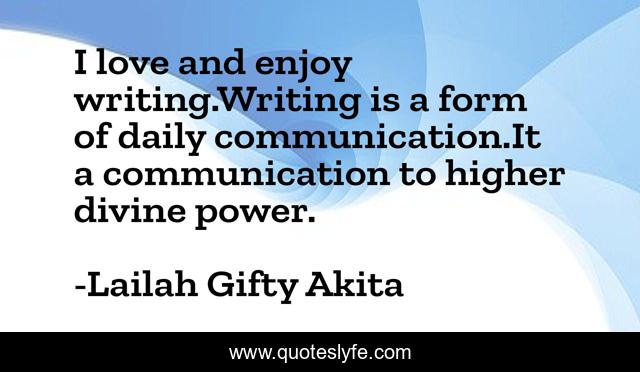 This page presents the quote "I love and enjoy writing.Writing is a form of daily communication.It a communication to higher divine power.". Author of this quote is Lailah Gifty Akita. This quote is about communication, communications,.