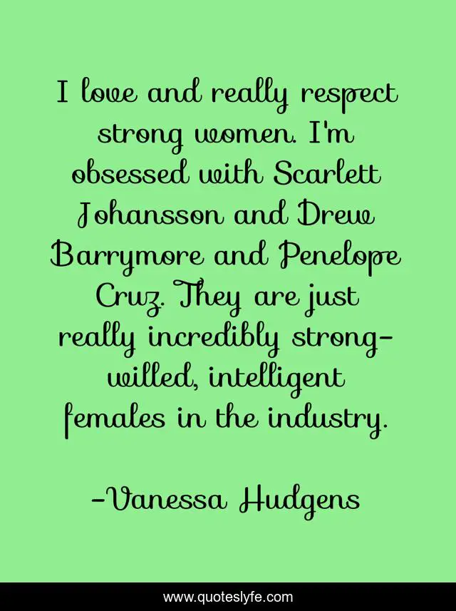 This page presents the quote "I love and really respect strong women. I'm obsessed with Scarlett Johansson and Drew Barrymore and Penelope Cruz. They are just really incredibly strong-willed, intelligent females in the industry.". Author of this quote is Vanessa Hudgens. This quote is about strong, love, affection, women,.