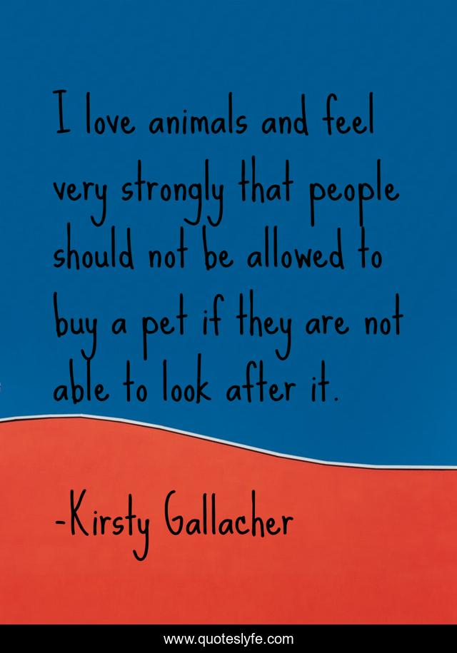 This page presents the quote "I love animals and feel very strongly that people should not be allowed to buy a pet if they are not able to look after it.". Author of this quote is Kirsty Gallacher. This quote is about love, animals, affection, people,.