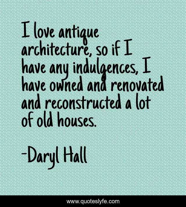 This page presents the quote "I love antique architecture, so if I have any indulgences, I have owned and renovated and reconstructed a lot of old houses.". Author of this quote is Daryl Hall. This quote is about houses, old, affection, love,.