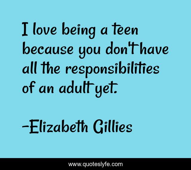 This page presents the quote "I love being a teen because you don't have all the responsibilities of an adult yet.". Author of this quote is Elizabeth Gillies. This quote is about being, love, affection,.